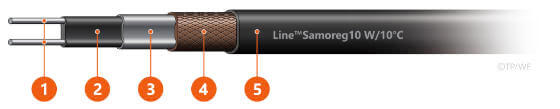 Samoregulačný kábel s výkonom 10 W/m pri 10 °C, alebo Line™SamoregF10W/10°C *. Písmeno F znamená fluórpolymérovú (teflonovú) izoláciu. Kábel je vhodný do agresívneho prostredia.